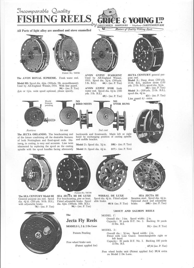 It seems that in the early 1960s, Grice & Young changed their manufacture slightly and marketed the Avon Gypsy, Avon Royal, the Avon Crown, and a new model of the Jecta, all characterised by a rim lever ratchet switch, riveted construction, fixed handles, coloured handle bases (green,blue,orange and red), fixed line guard and a different style of line pillar with a concave appearance. Model names were engraved and the reels generally finished in a painted grey enamel. The spools themselves characterised by 8 large symmetrical holes. At the time that these reels were available, the Avon Royal Supreme became the Avon Royal Superb when in its 3 3/4 inch size and the Avon Crown Superb when in its 4 1/2 inch size.